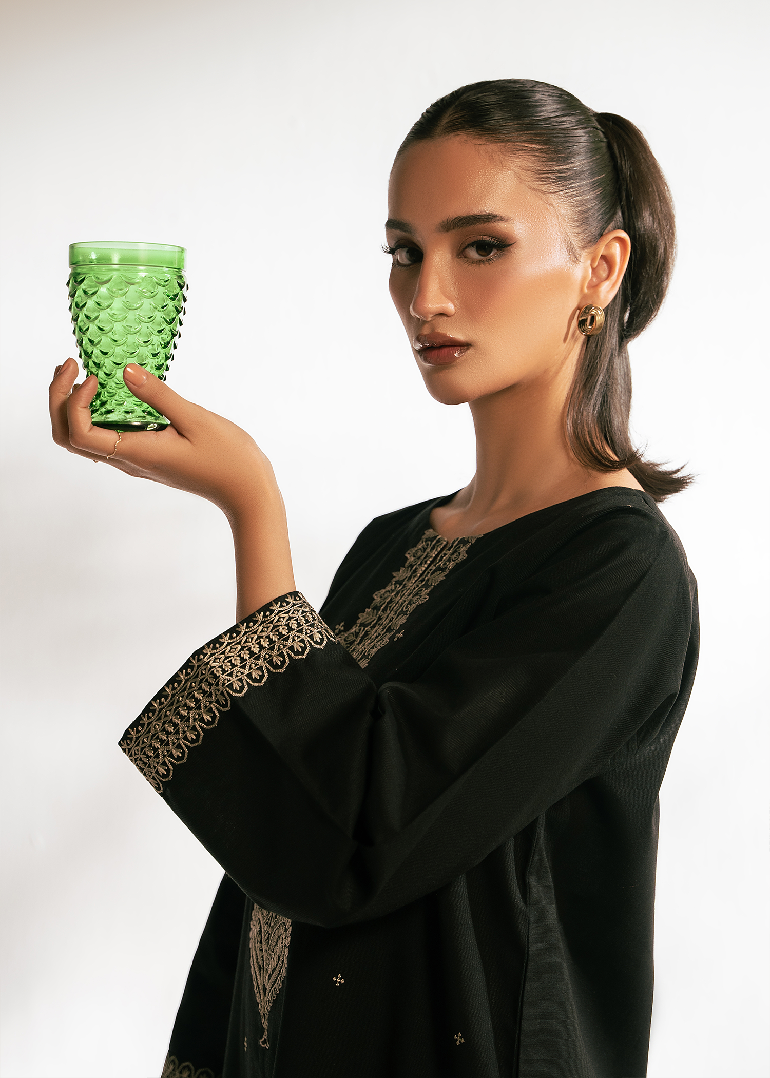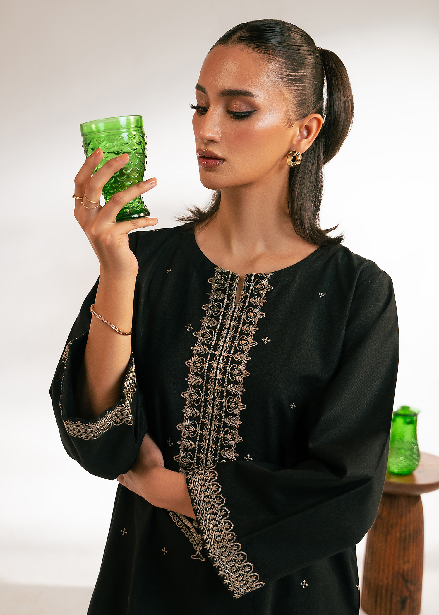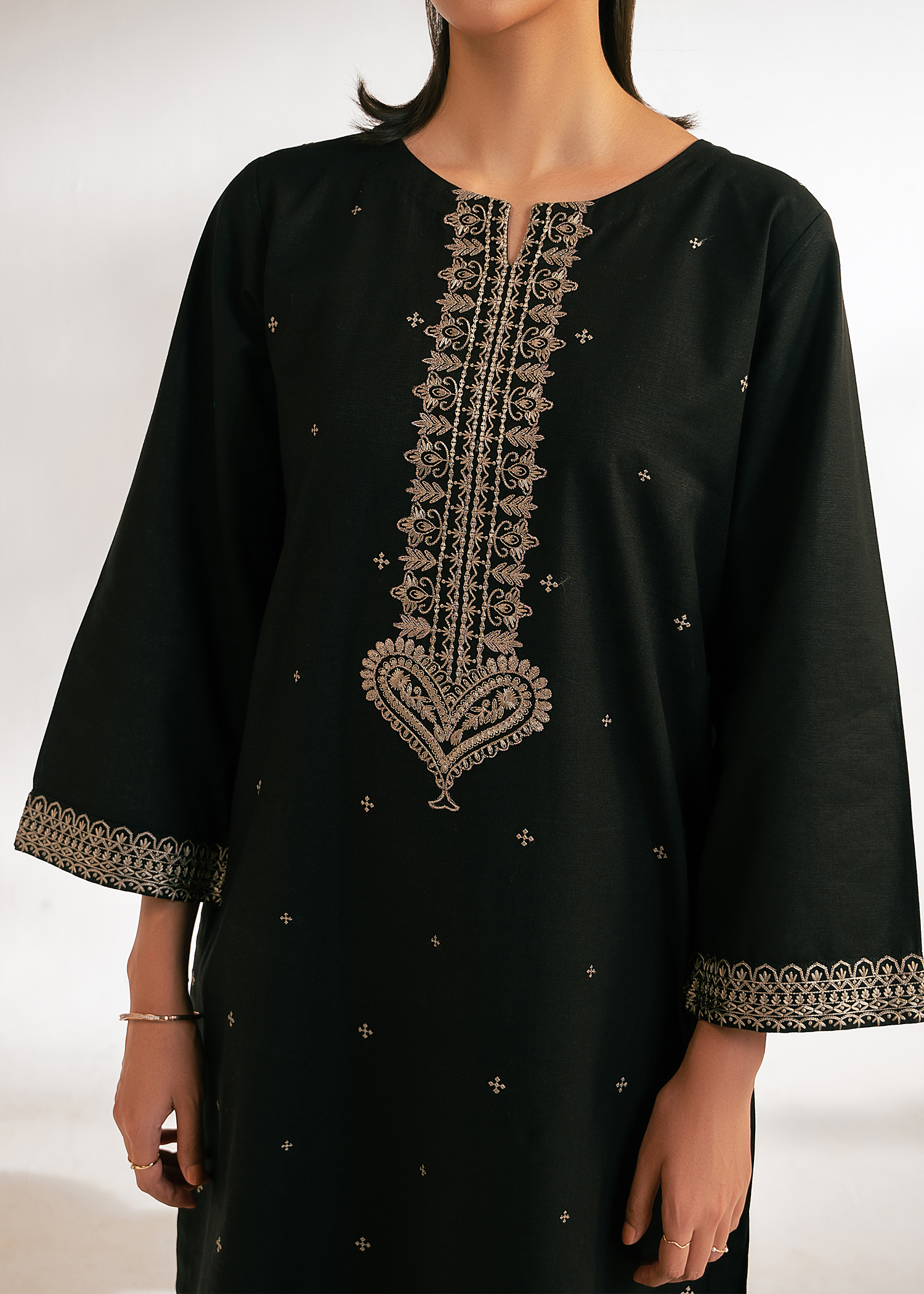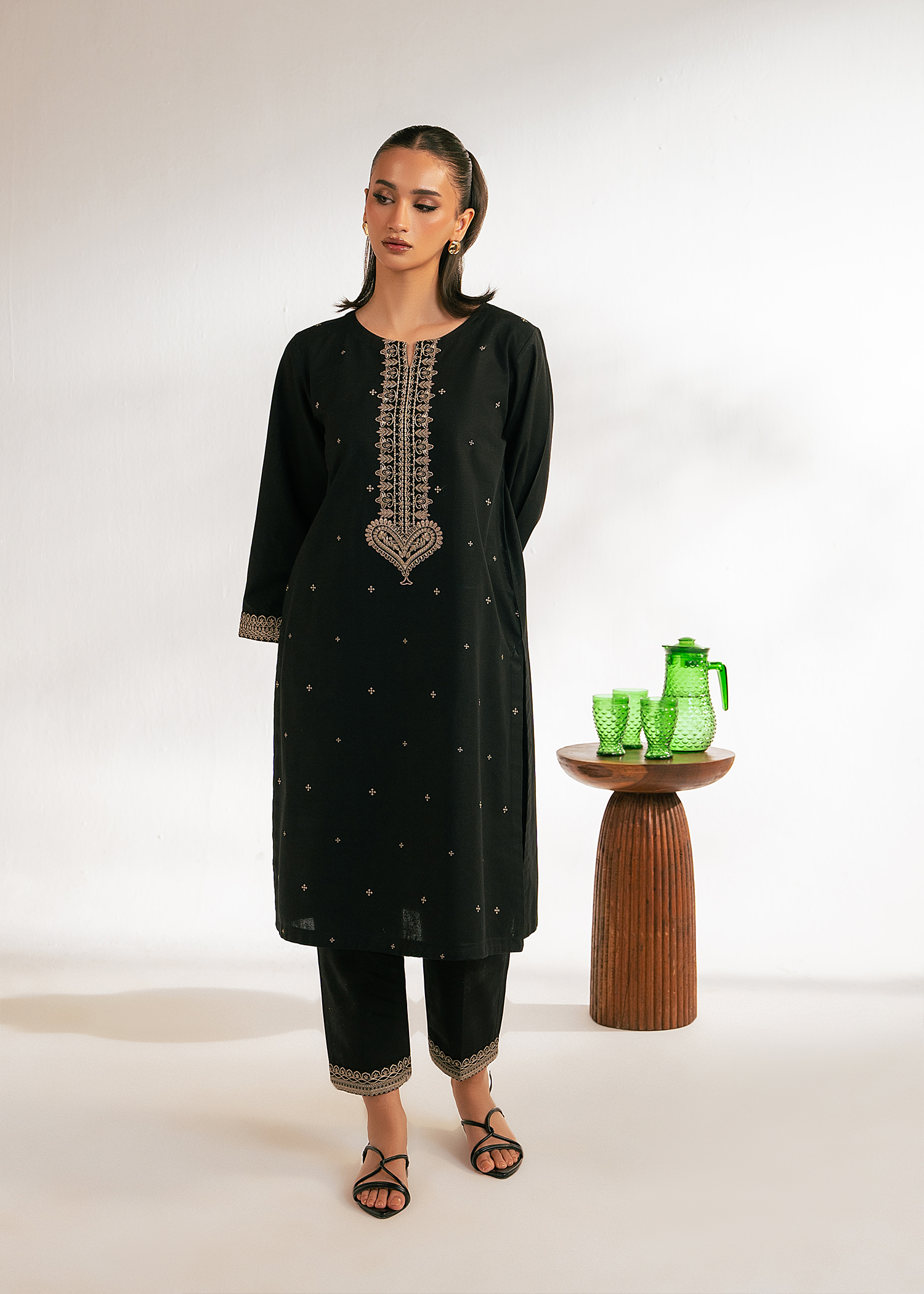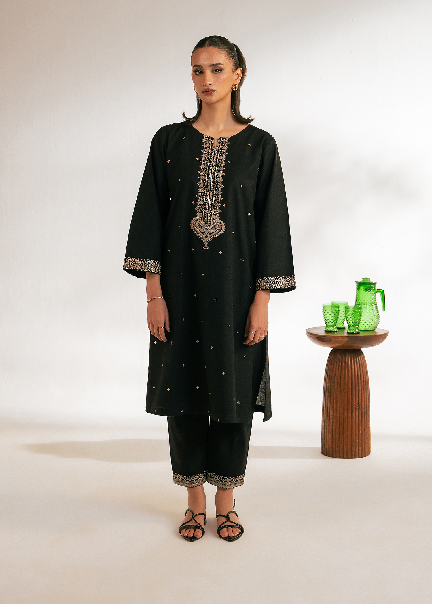 Elegant two-piece black khaddar set featuring a long shirt paired with straight trousers. Grey embroidery on the neckline, a delicate spray on the front, and embroidered borders on the sleeve openings and trouser hems. The addition of chawal tanka with running stitches.
