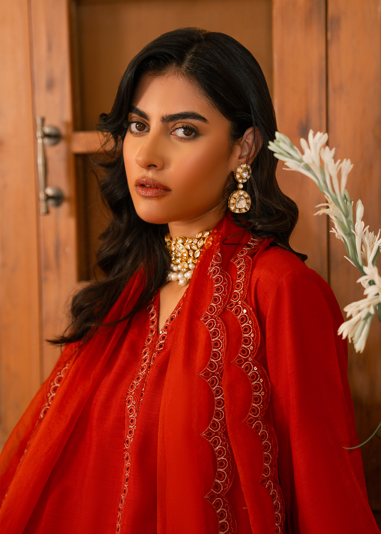This rust coloured article has gold tilla embroidery on the short, modern shirt. It is paired with a traditional loose shalwar making it a perfect fit for events. Gold tilla and rust thread is used to create a scallop like pattern on the borders of the rust organza dupatta.